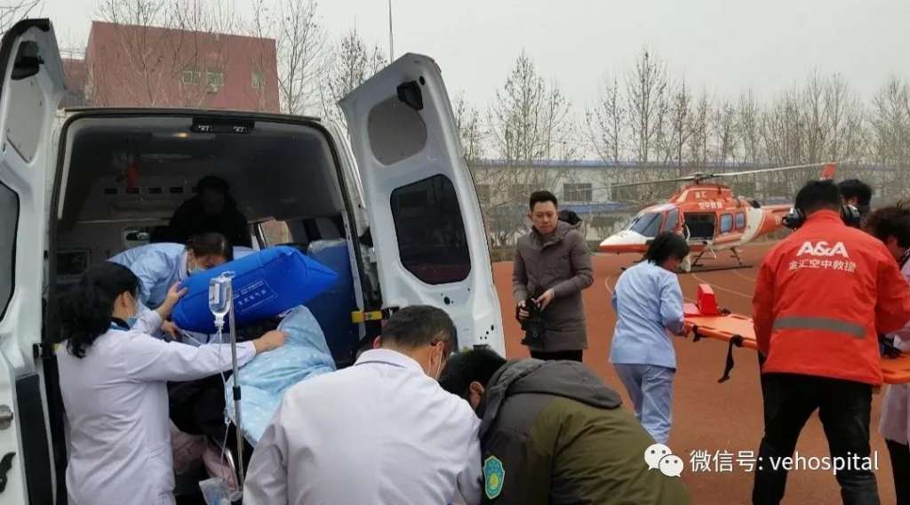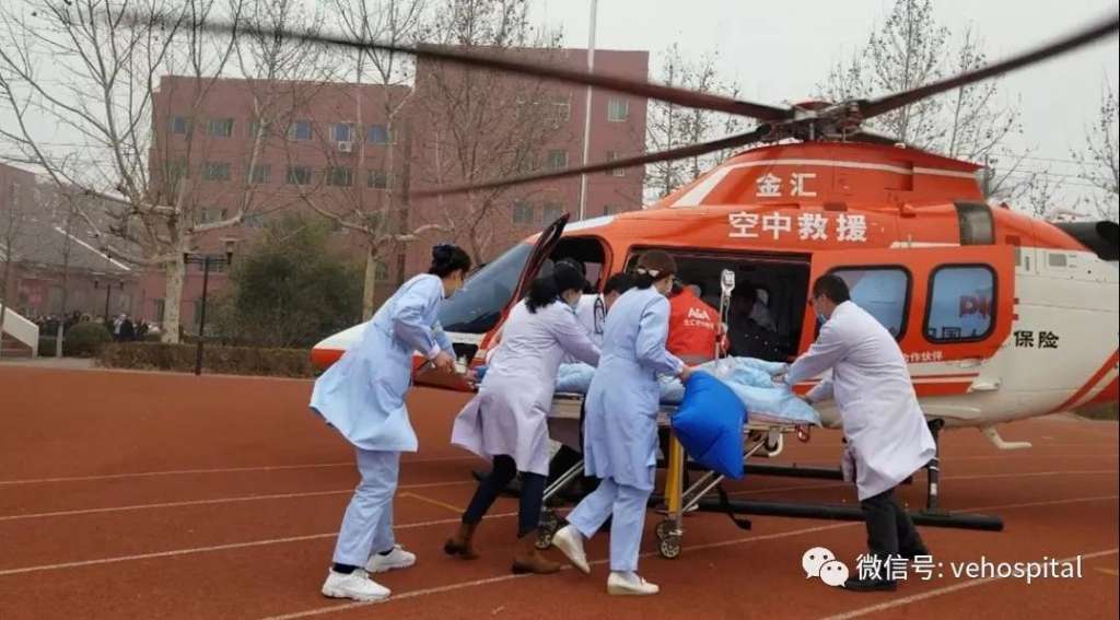 与此同时,潍坊卫恩医院党支部书记于静迅速联系卫计委,潍坊众飞协调救援直升机,患者通过潍坊众飞救援系统,呼叫空中救援;总控制室GPS精确定位现场位置,电话问明情况后,于静书记立即联系护理学院启动应急停机坪,全部进入待命状态。上午10点51分,魏院长带领呼吸危重症治疗中心的王萍护士长登上了救援直升机。